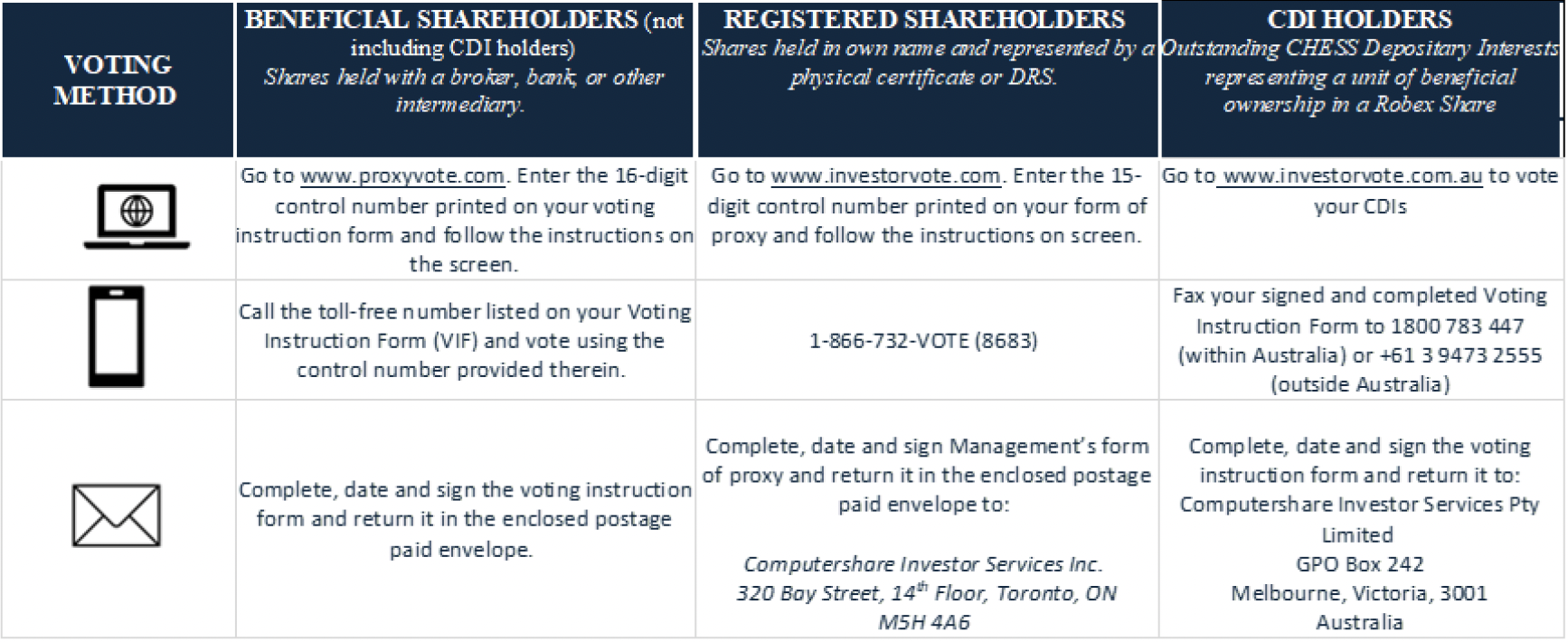 Complete, date and sign Management’s form of proxy and return it in the enclosed postage paid envelope to: Computershare Investor Services Inc. 320 Bay Street, 14th Floor, Toronto, ON M5H 4A6 |